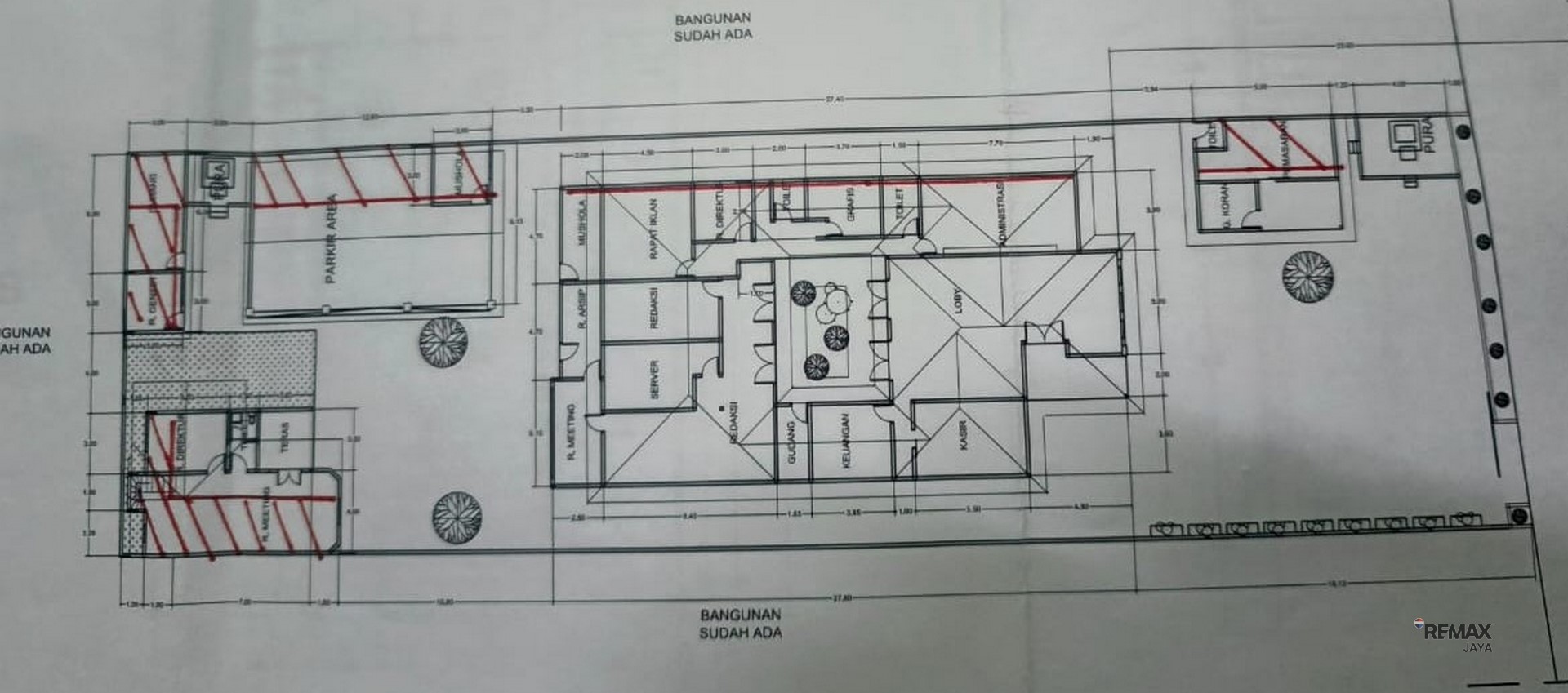The property consists of a main office building located in the central area, a separate additional office building, a warehouse, and a wide parking area. The layout is professionally designed and highly functional, with well-organized and private circulation that supports efficient business activities.